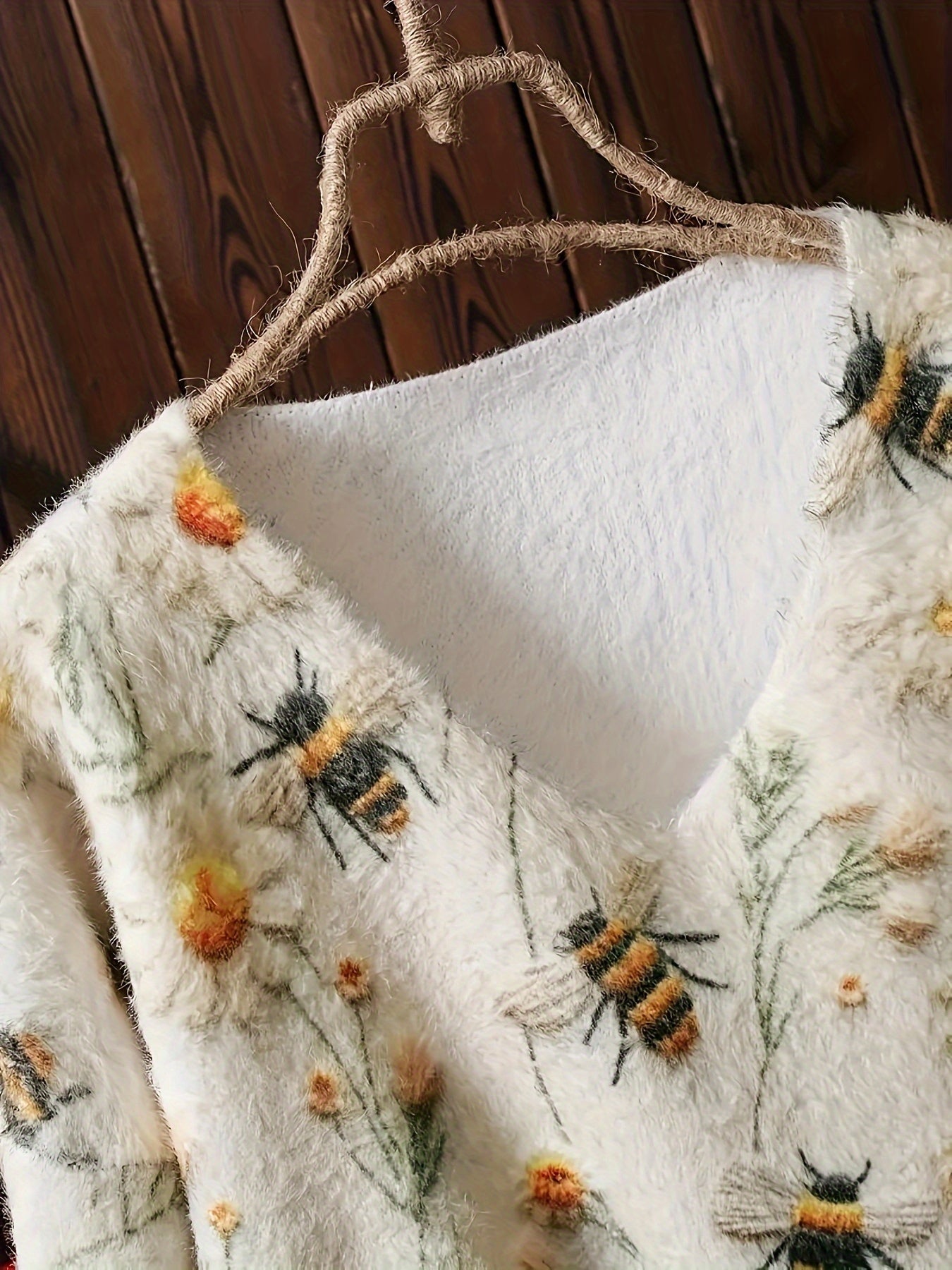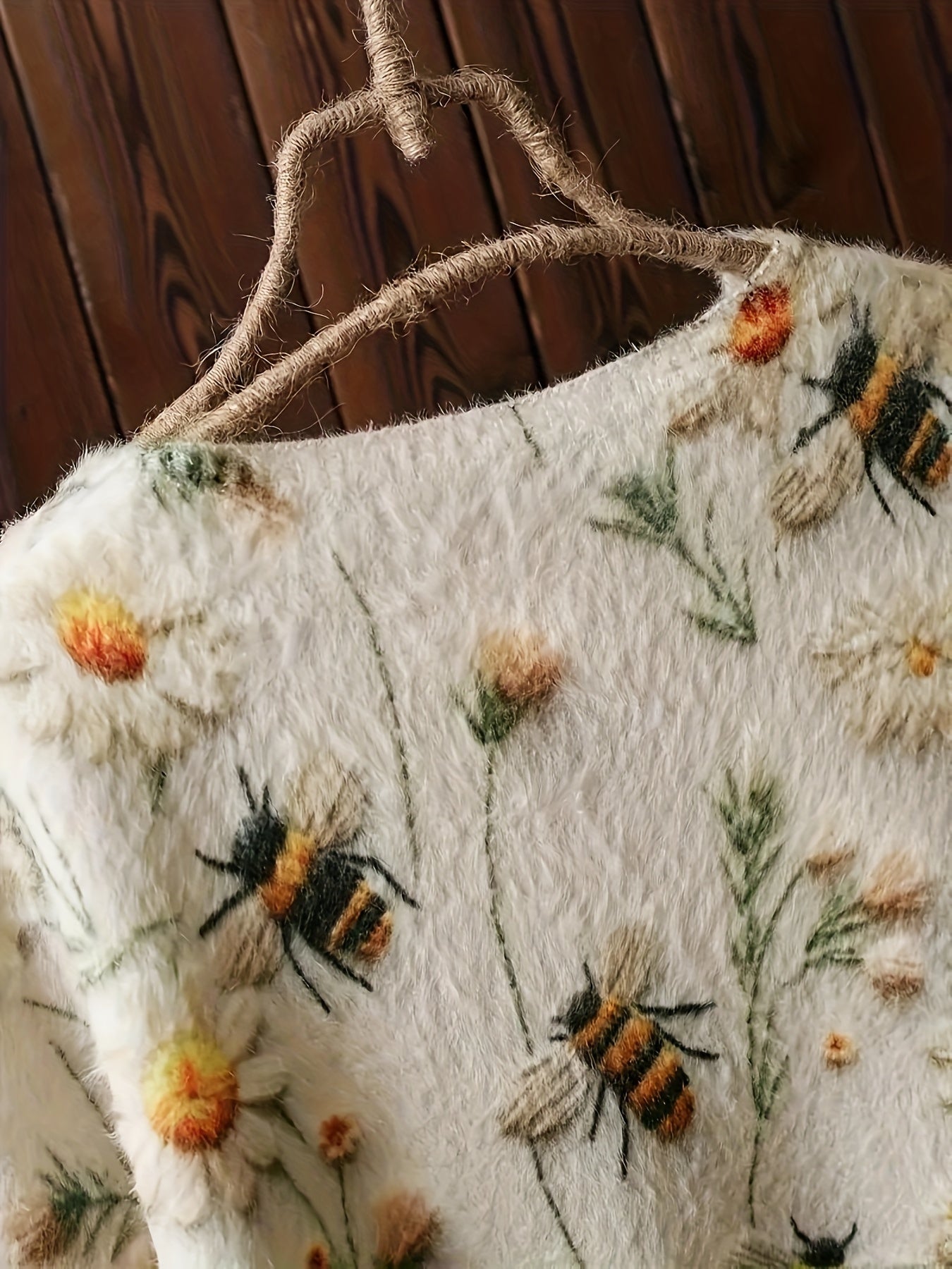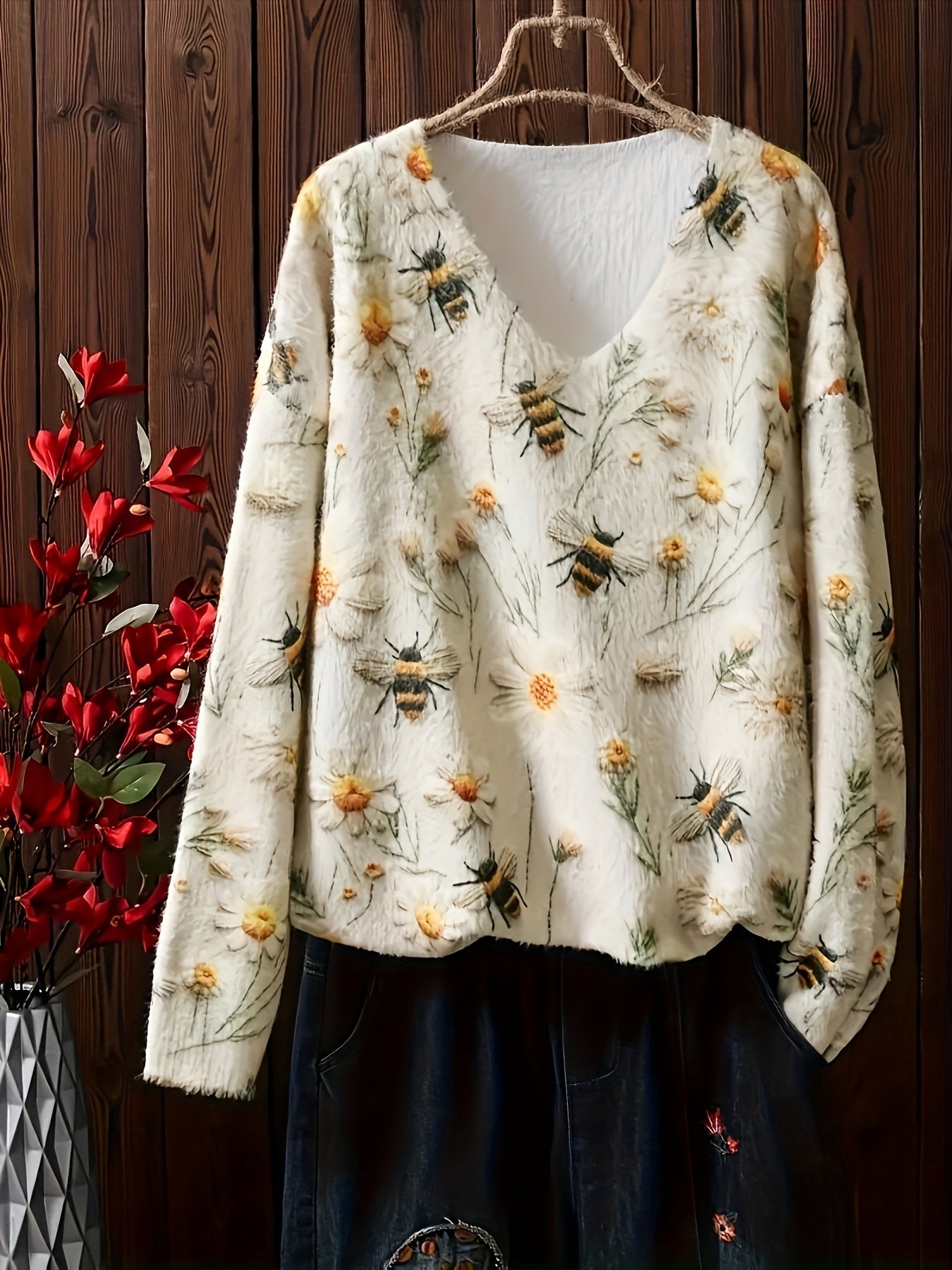 Plus Size Bee & Floral Pattern Sweater, Casual Long Sleeve V Neck Top For Fall & Winter, Women's Plus Size Clothing