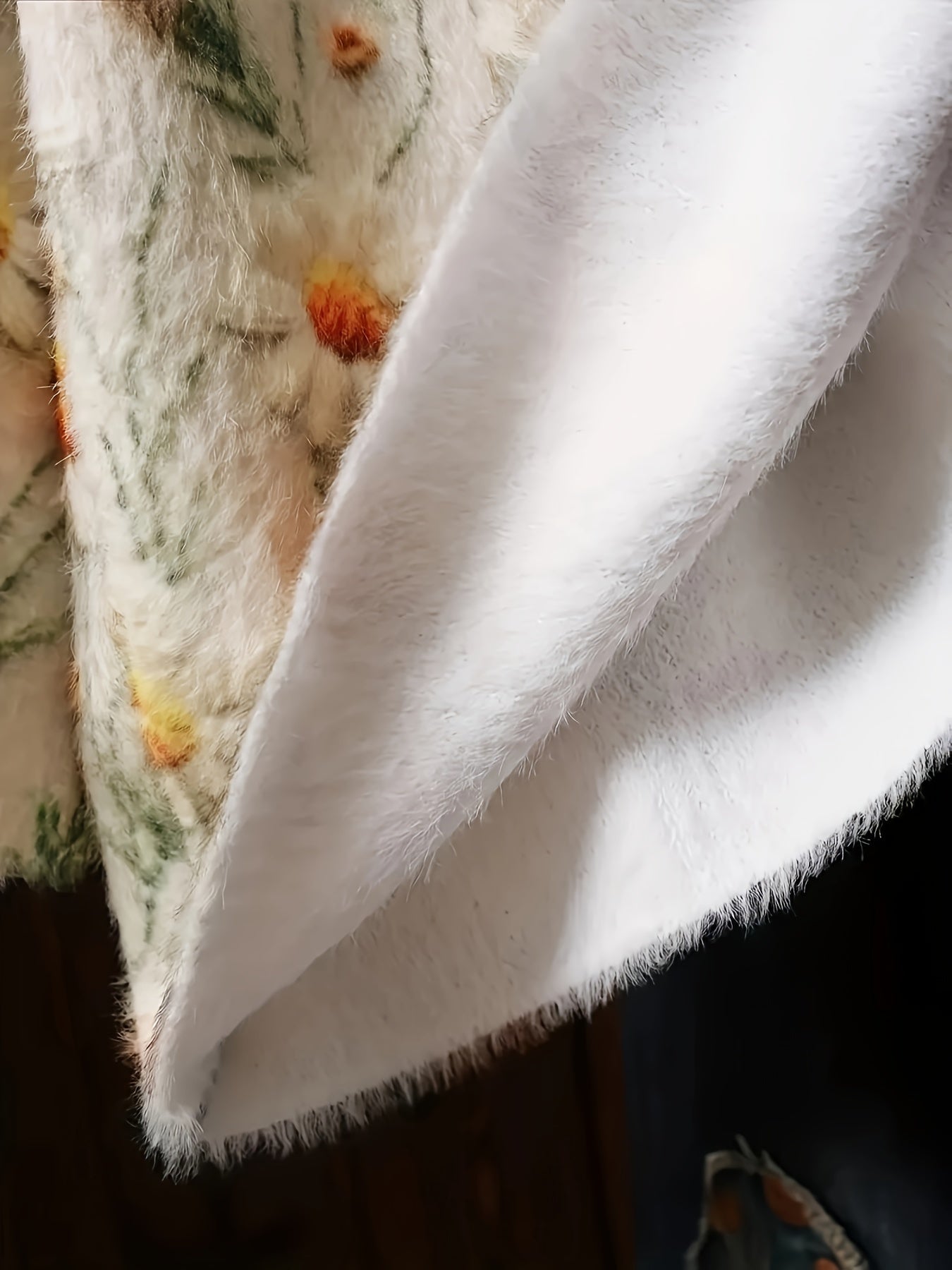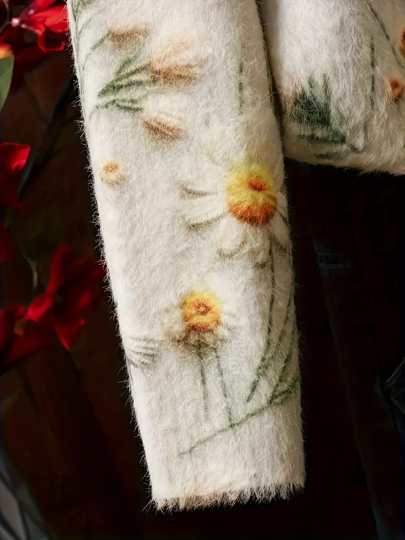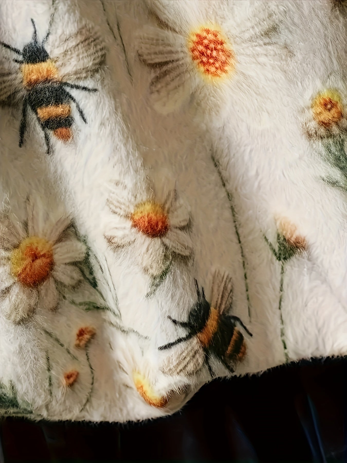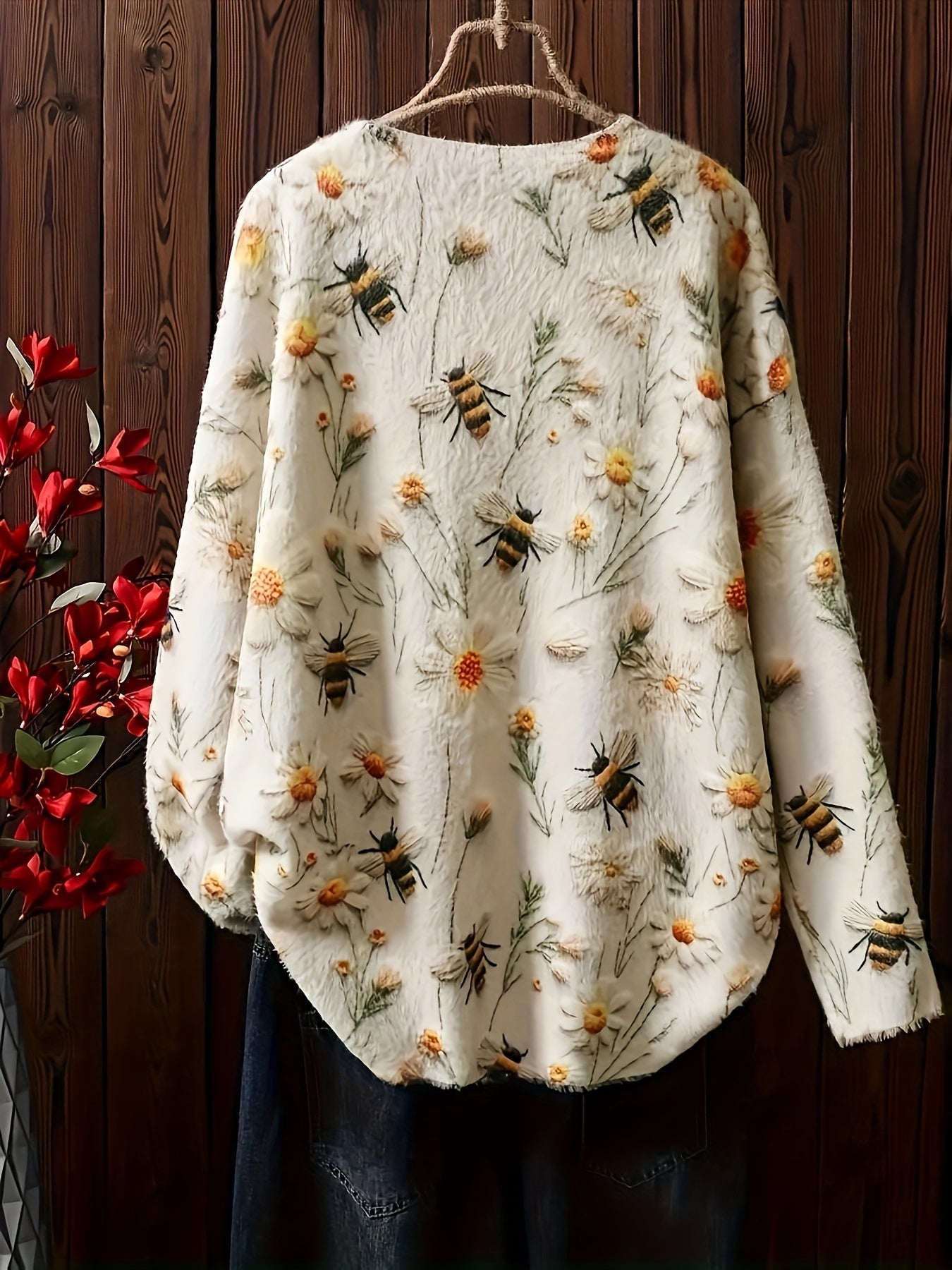 Plus Size Bee & Floral Pattern Sweater, Casual Long Sleeve V Neck Top For Fall & Winter, Women's Plus Size Clothing